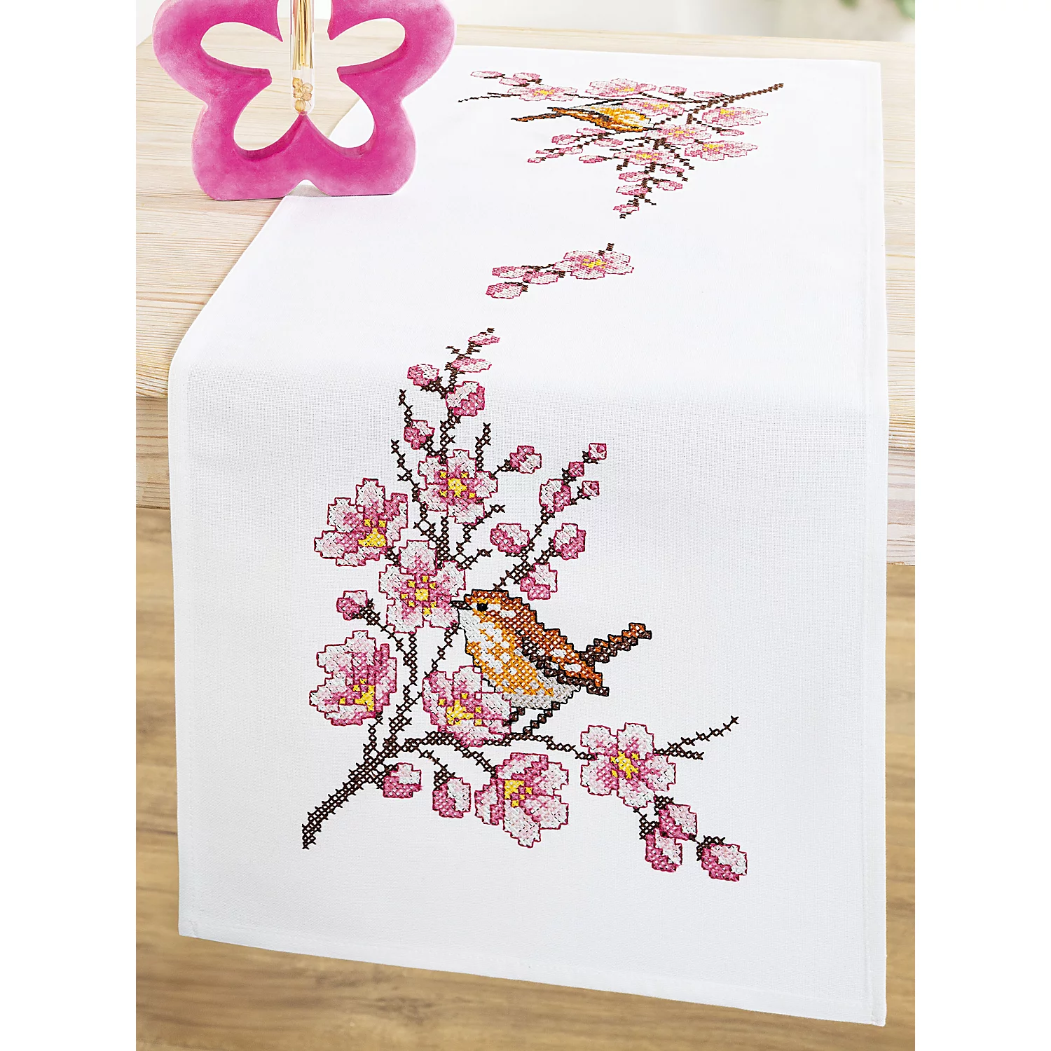 Stickläufer Kirschblüten-Zweig, zum Besticken in Kreuzstich. Vorgedrucktes Motiv, randfert...