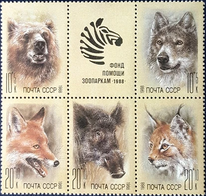 Sowjetische Poststempel, Portojahr 1988, Zootiere, Bär, Wolf 5, völlig neue Briefmarken zu...