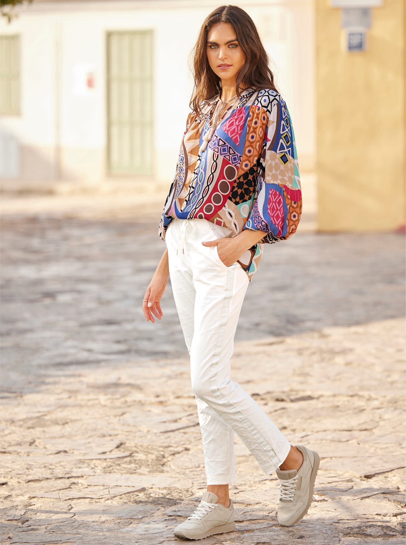 Druckbluse Aus fließender Viskose mit ausgefallenem Print-Dessin. Rundhals-Ausschnitt mit schm...