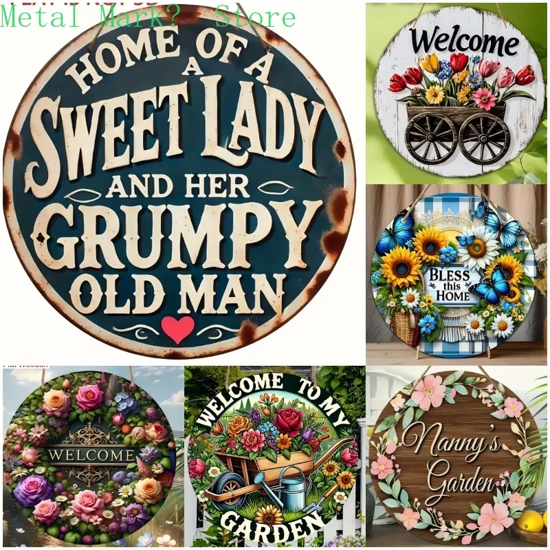 Vintage-Garten-Willkommensschild aus Holz – rustikale runde Hängedekoration mit Blumen- u...