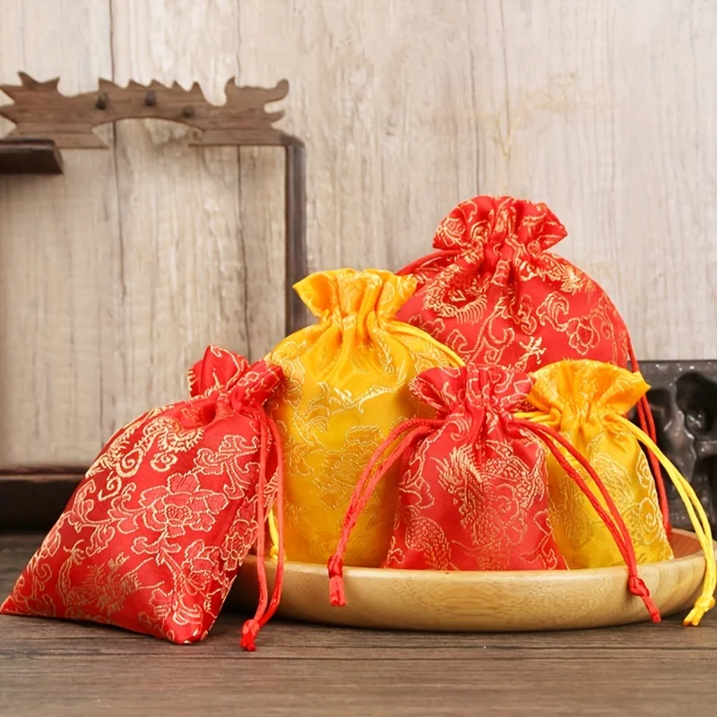 6 stücke Brokat bestickte Schmuck Aufbewahrung taschen, rot gelbe Drachen Muster Segen Taschen,...