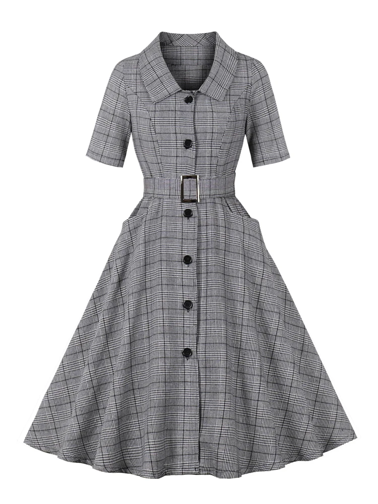 2023 elegante Vintage Halbarm Tasche Swing Kleid drehen Kragen Knopf oben Kleidung für Frauen F...
