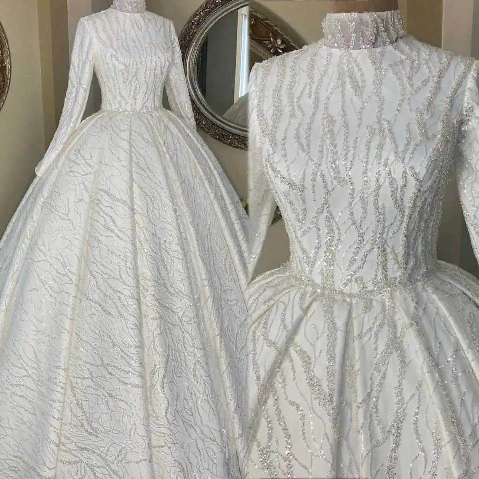 Gorgeous Ball Gown Beide Dresses Sequined Beaded High Neck Wedding Dress Customized Long Sleeve Swee...