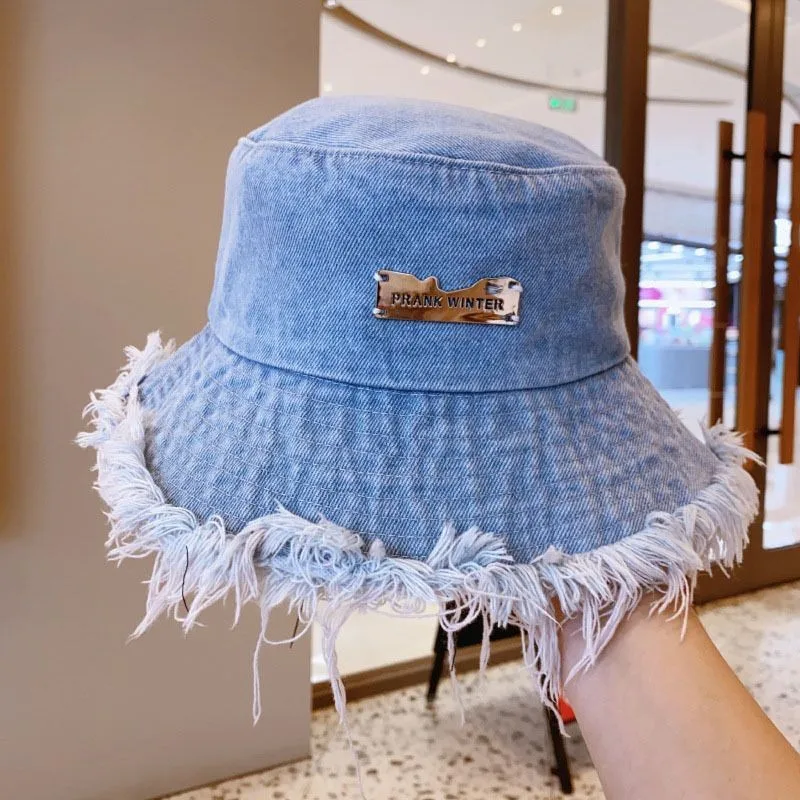 Fischerhut mit rohem Saum – leichter Fischerhut mit ausgefranstem Rand und Metallbuchstaben-Et...
