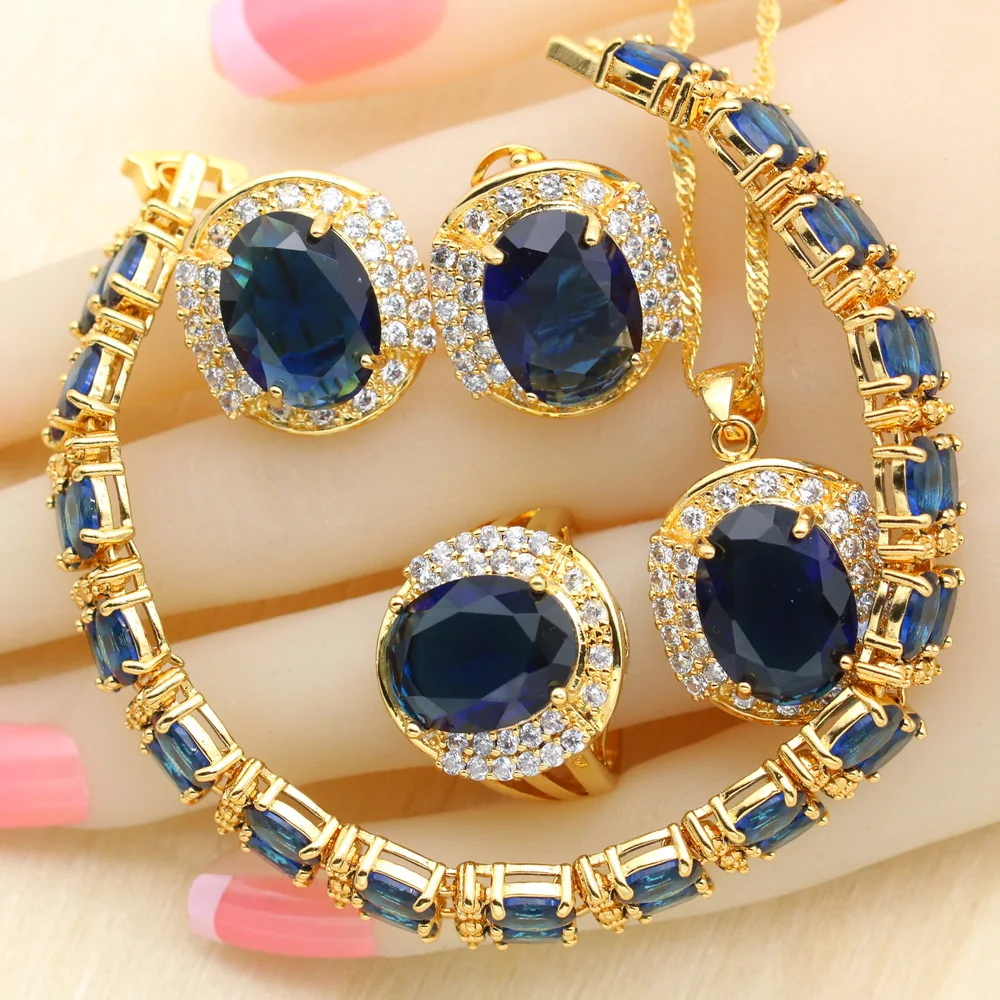 Dunkelblaue Steine, goldfarben, Brautschmuck-Sets für Frauen, Ohrringe, Halskette, Anhänge...