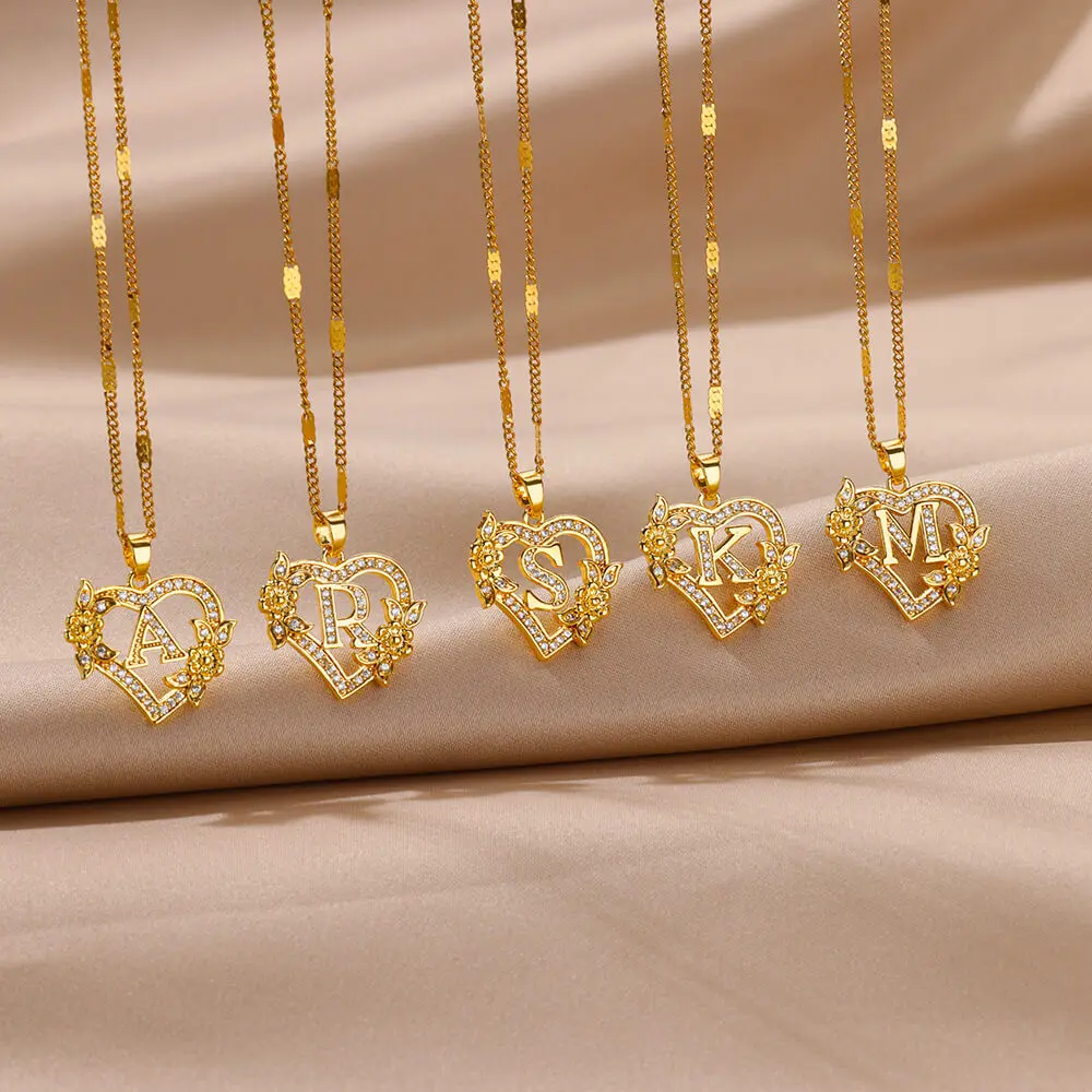 Zirkon Herz Blume Brief Halsketten für Frauen Edelstahl A-Z Br...