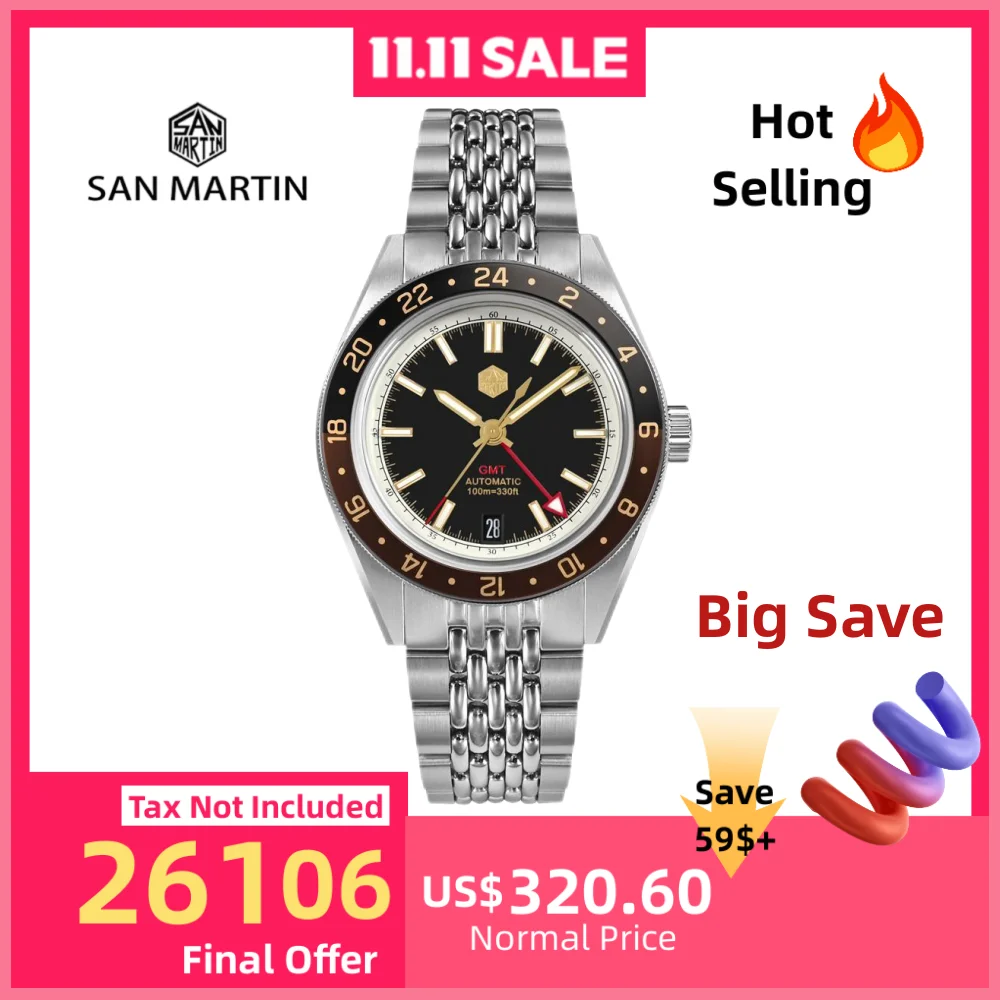 San Martin 39,5 mm Limited Edition Full Lume Zifferblatt Automatik Herrenuhr NH34 GMT 6H Datum 10Bar...