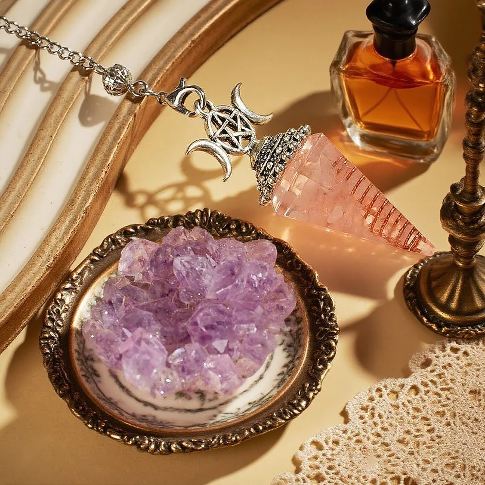 2-teiliges Kristall-Geist-Pendel, gepaart mit natürlichen Amethyst-Clustern, verwendet als Wahr...