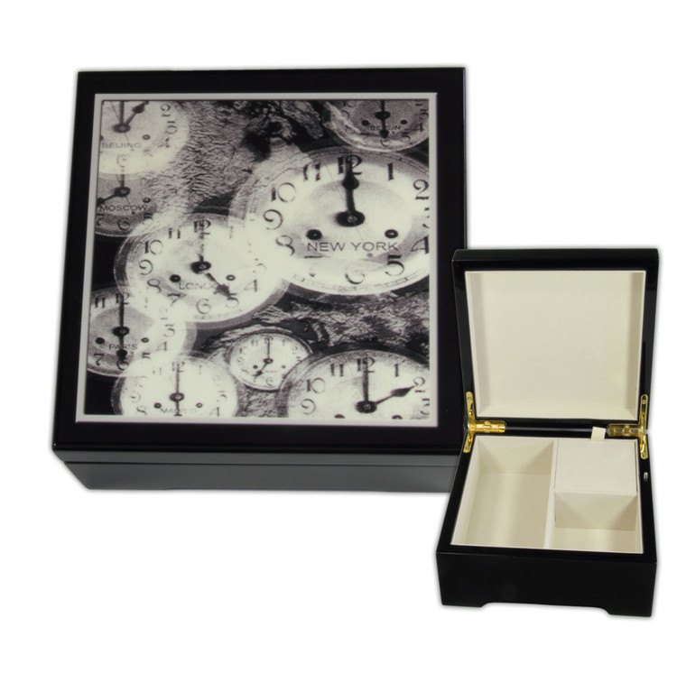 Quadratische Spieluhr Schatulle in schwarz - weiß, glänzend lackiert. Auf dem Deckel sind...