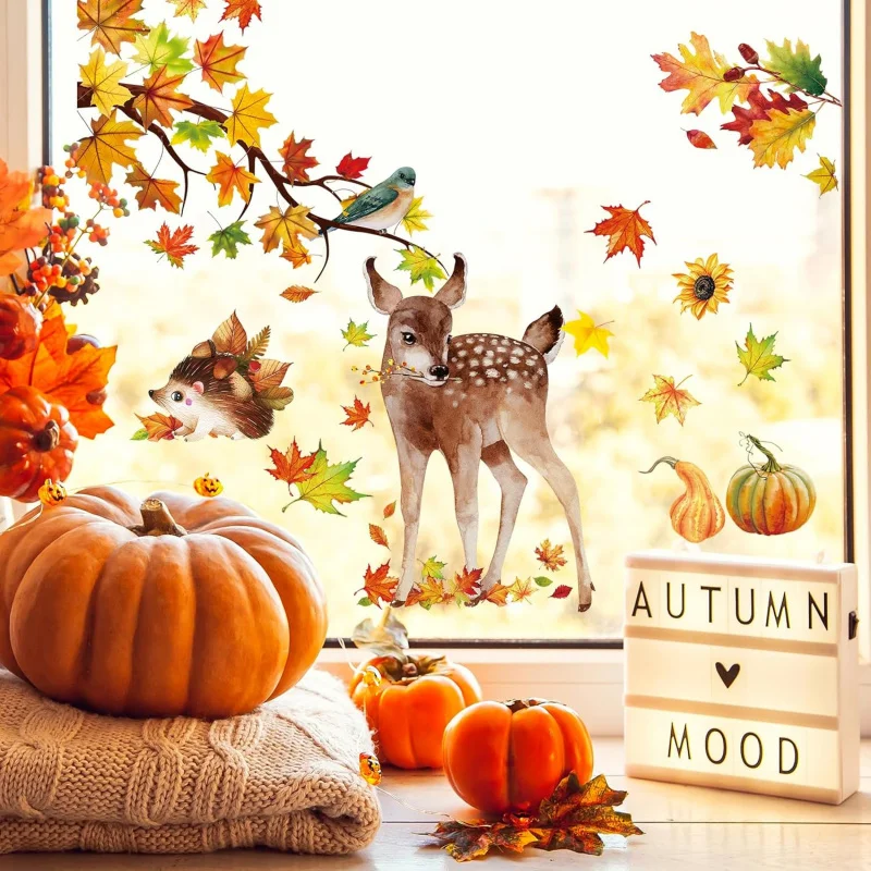 Herbstliche Ahornblatt-Tier-Fensteraufkleber, abnehmbare PVC-Aufkleber für Raumdekoration, wass...
