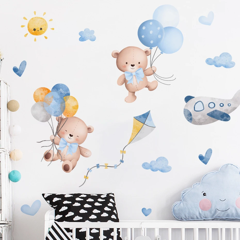 Aquarell Cartoon Bär Kaninchen Luftballons Wolken Wandaufkleber Kinderzimmer Vinyl Kinder Wandk...