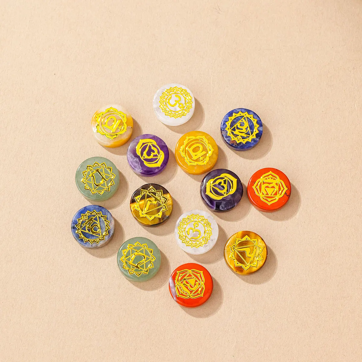 1set Natürliche Sieben Farbe Kristall Rohsteine Runde Yoga Symbole Halbedelstein Massage Steine...