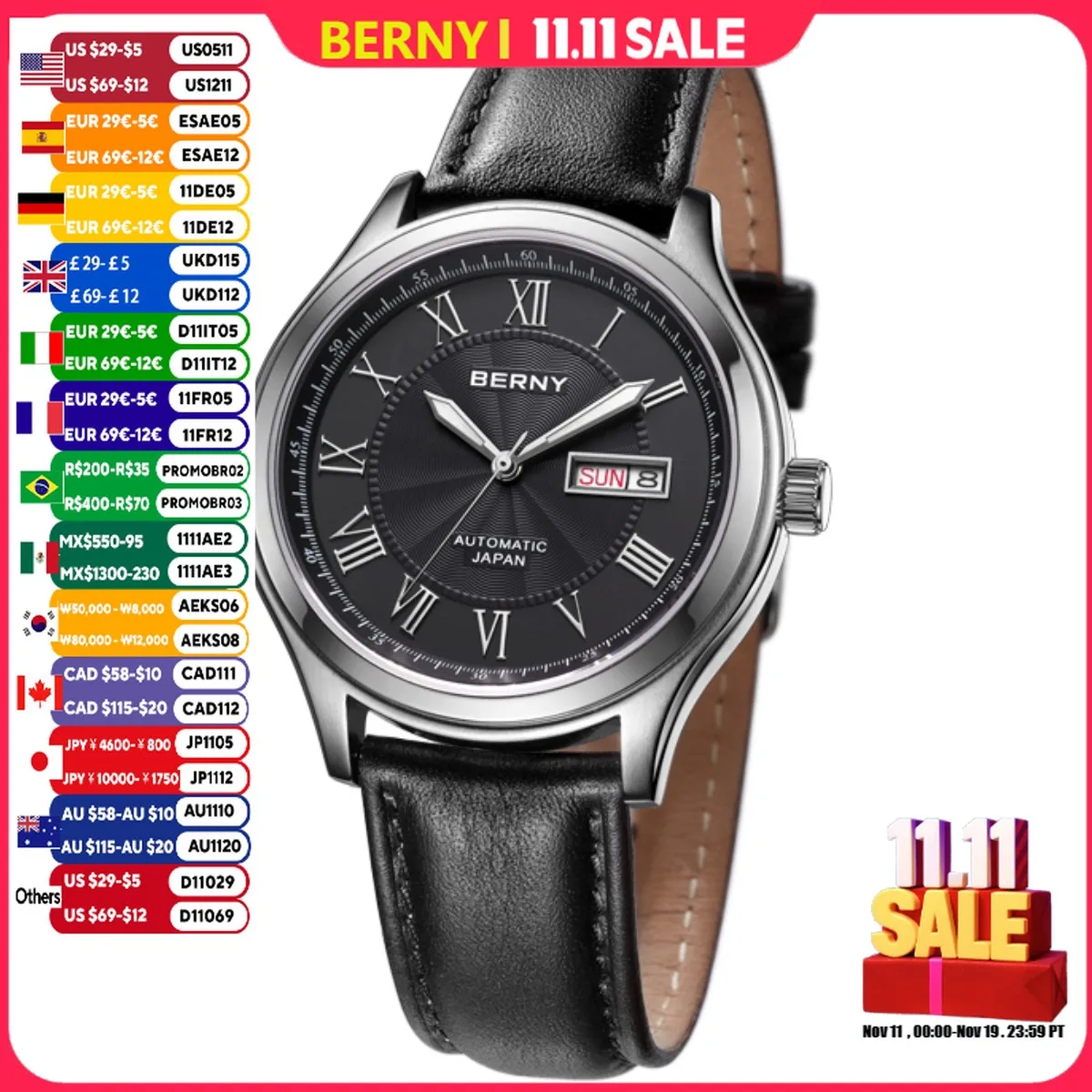 BERNY Automatikuhren für Herren, Saphir, leuchtende Zeiger, Tageskalender, Kleid, luxuriös...