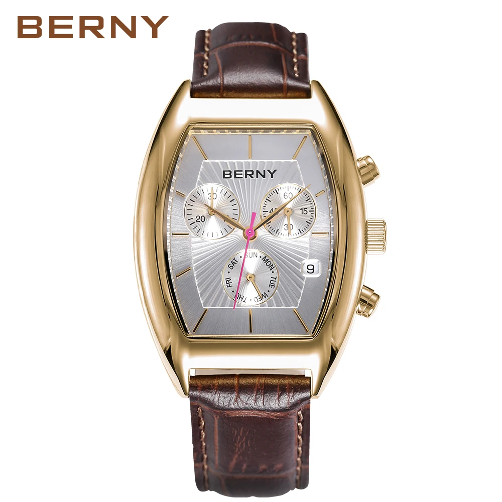 BERNY Herrenuhr, klassische Tonneau-Quarz-Chronographenuhr für...
