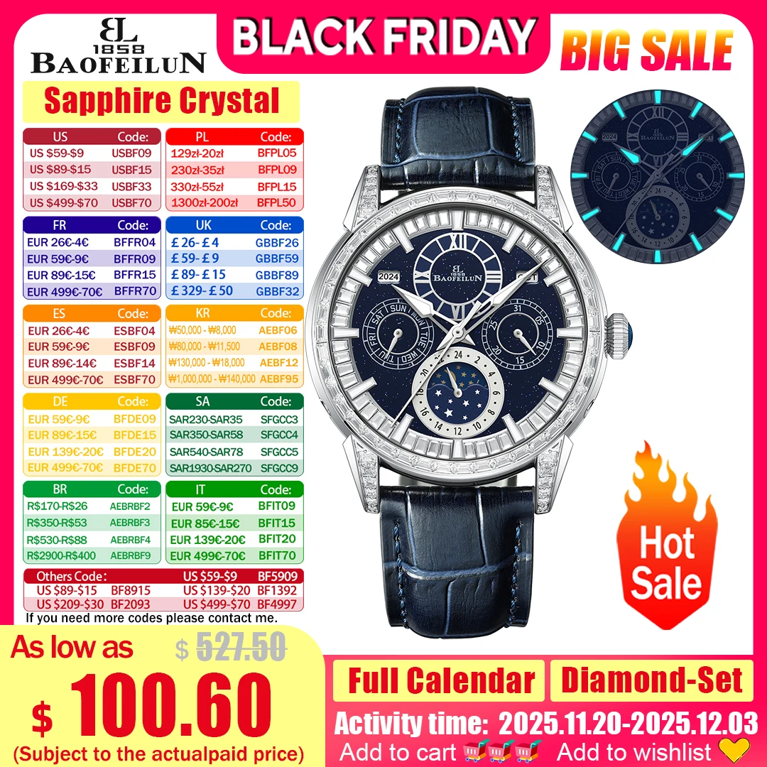 BAOFEILUN Iced Out-Uhr, Automatikuhr, hohe Komplikation, Diamantuhr, italienisches Kalbslederarmband...