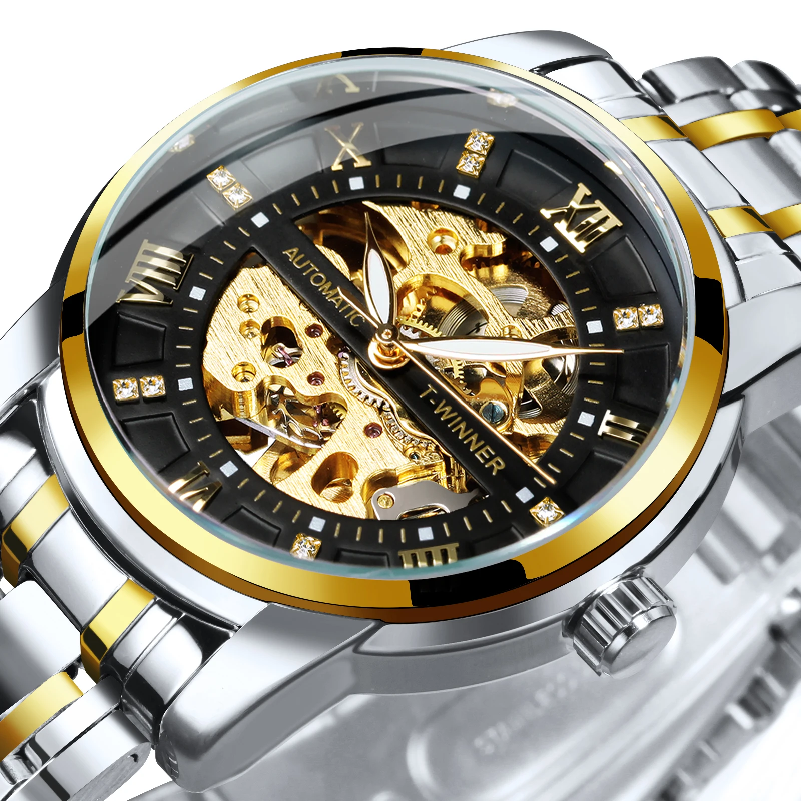 WINNER Gold Schwarz Mechanische Uhren Klassische Retro Iced Out Ske...