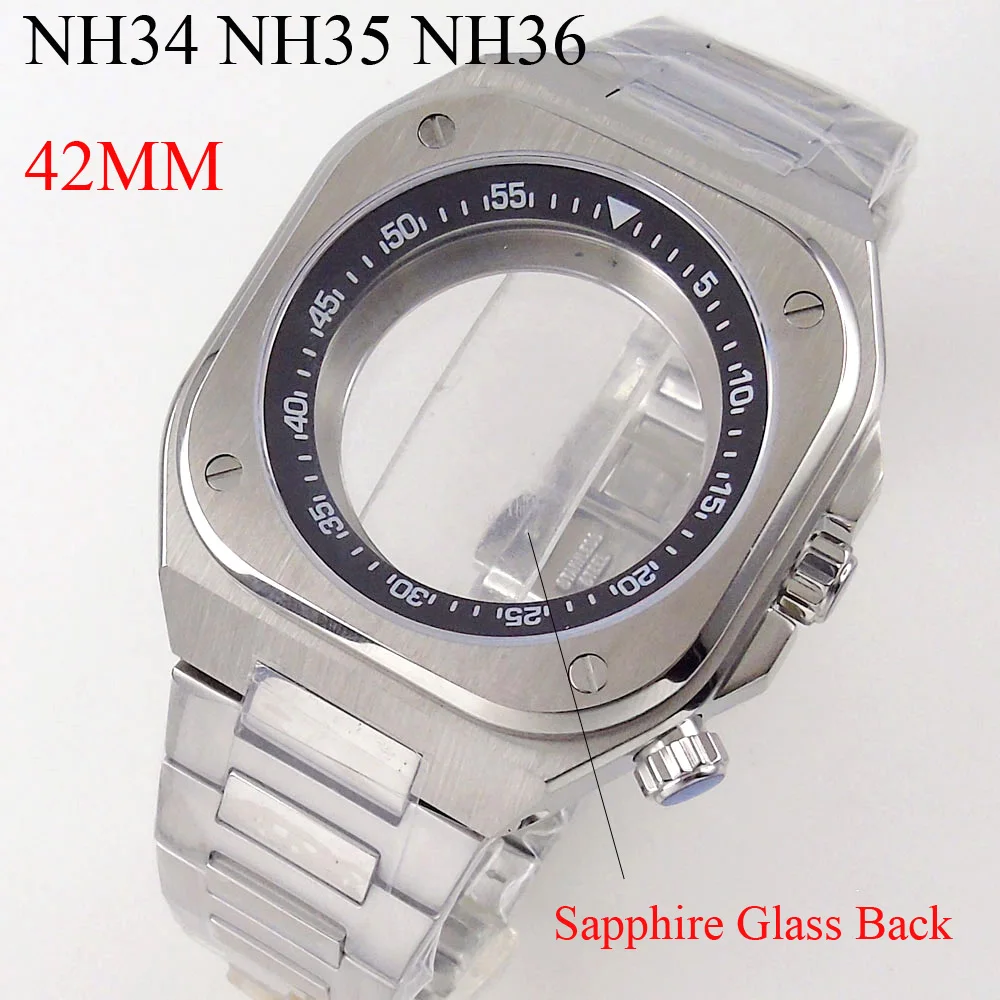 150 m wasserdichtes 42 mm quadratisches Stahl-Uhrengehäuse für NH34 NH35 NH36 Antireflecti...