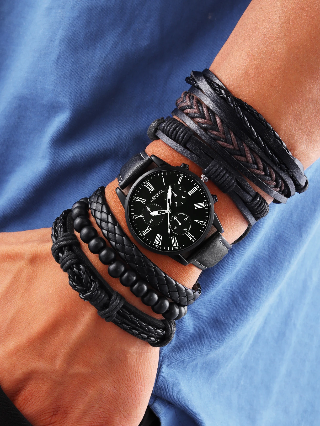Lässige Mode Strass Herren Leder Quarzuhr mit Leder Perlen Armband Halskette Set ausgewähl...