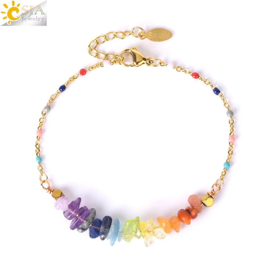 CSJA 7-Chakra-Naturstein-Kristall-Armband für Frauen, Edelstahl-Gliederkette, Amethyste, Chip-K...
