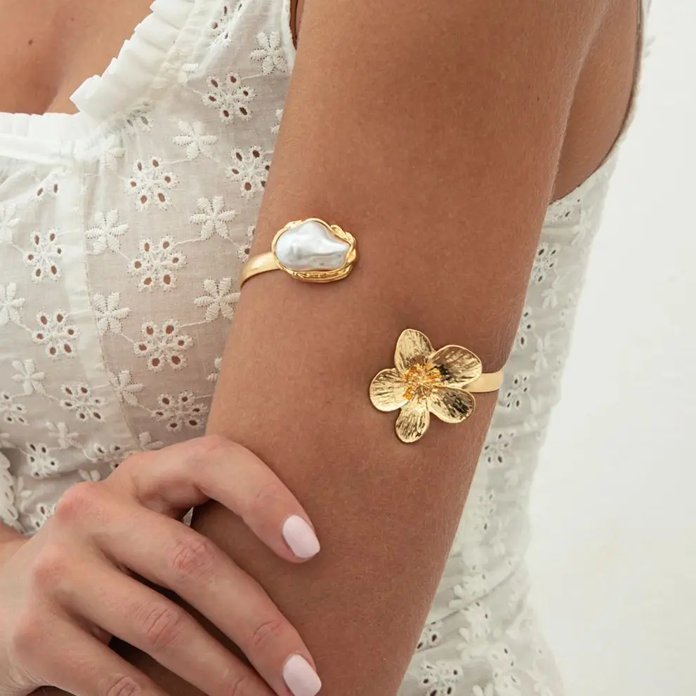 Ingemark 2025 New Bohemia Retro Gold Color Flower Open Bangles Women Fashionable Elegant Imitation P...