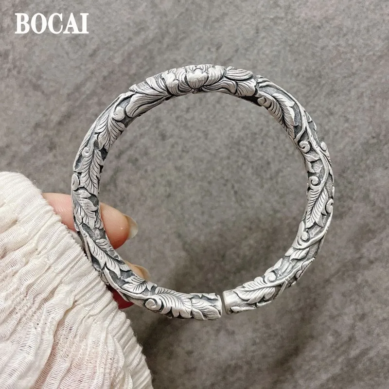 BOCAI Echt S999 Silber Schmuck Retro Ethnischen Stil Geschnitzt Drei-Dimensionale Pfingstrose Blumen...