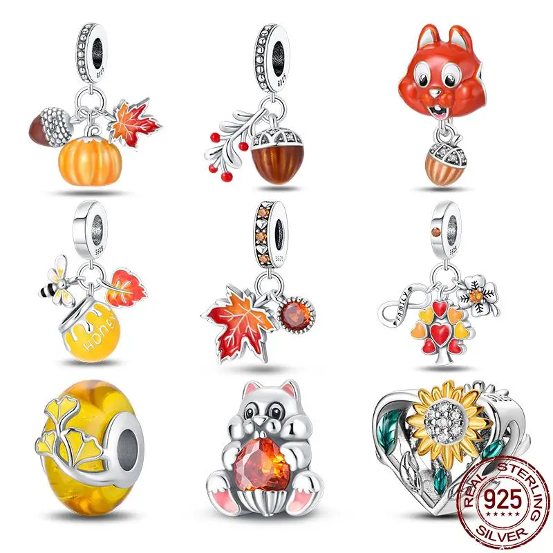 100% echt S925 Sterling Silber Herbst Ahorn Eichhörnchen Charms Fit Original Pan Armband Fü...