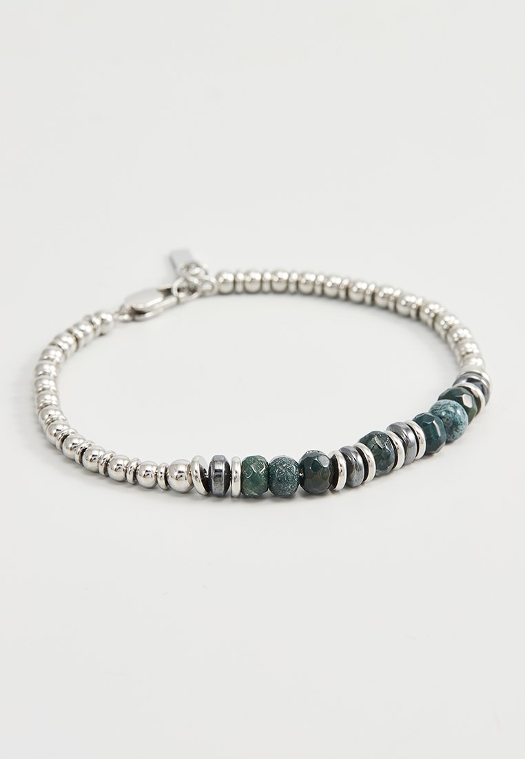 20 cm langes Edelstahlarmband mit moosgrünen Achatsteinen und Stahlstoppern. Anhänger mit ...