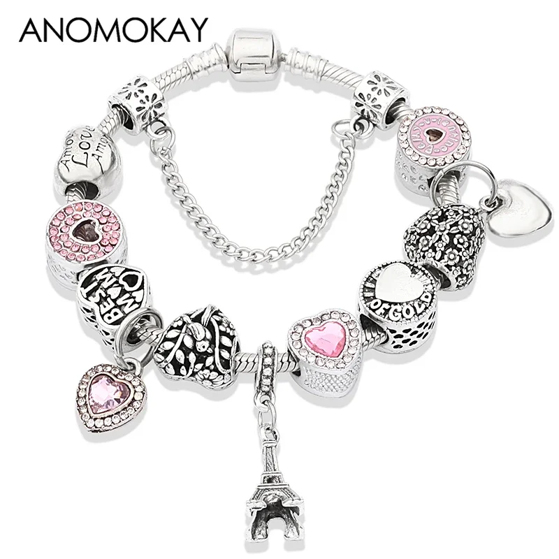 Versilbertes Eiffelturm-Herz-Anhänger-Armband, rosa Kristall-C...