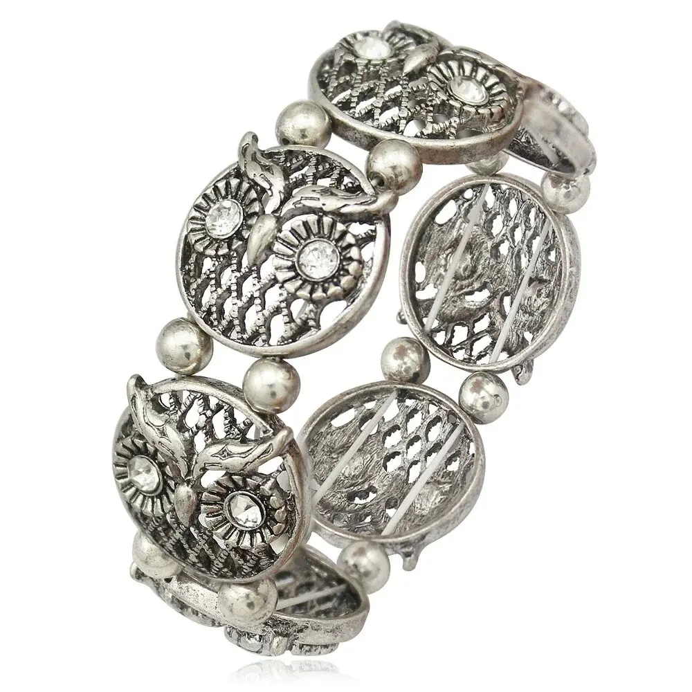 Vintage versilbert ethnischen Armband griechischen filigranen Weisheit Eule Kristall Auge Stretch Wi...