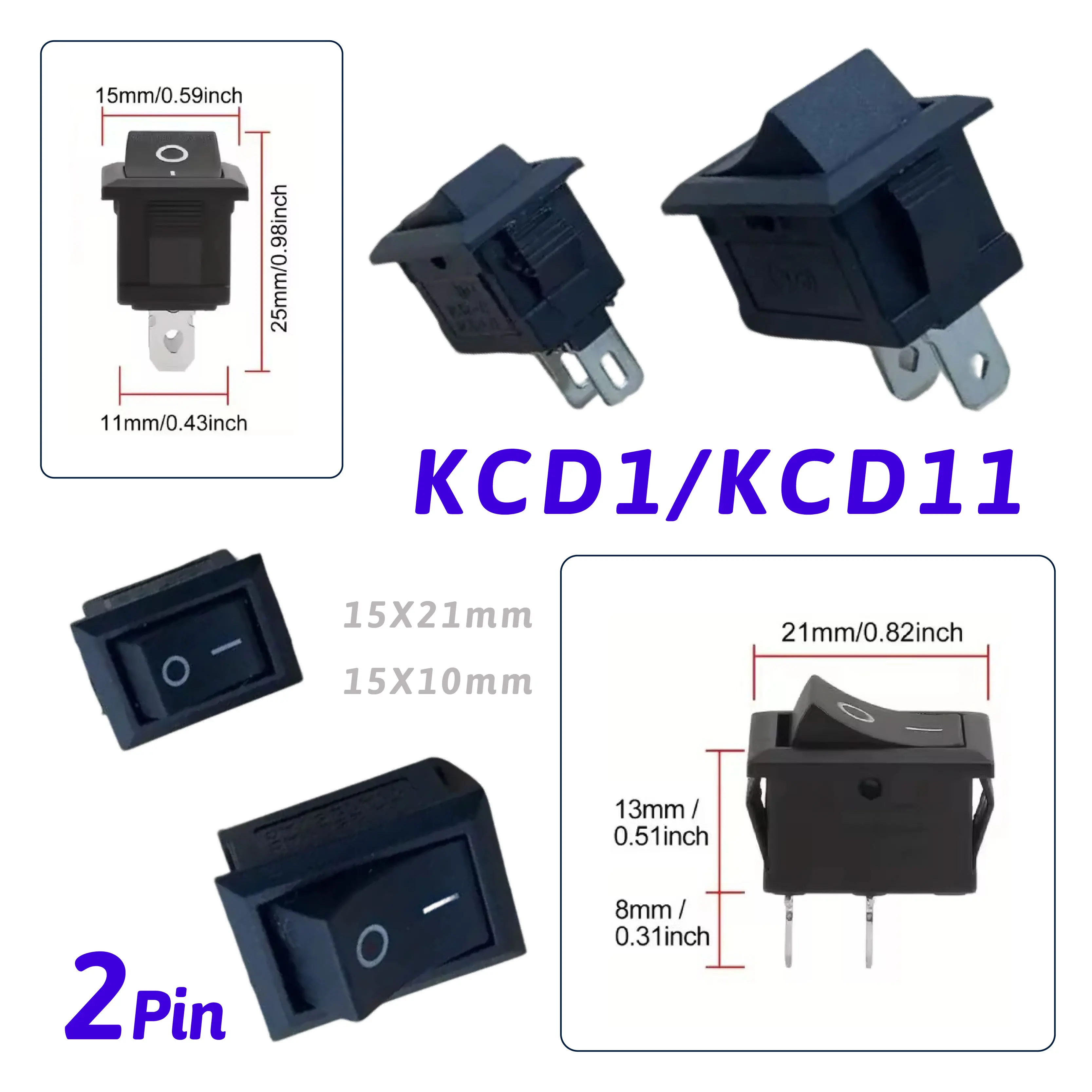 KCD1 2-poliger KCD11 SPST ON OFF Rocker Snap-in Black Boat Switch 15x21mm 10x15mm