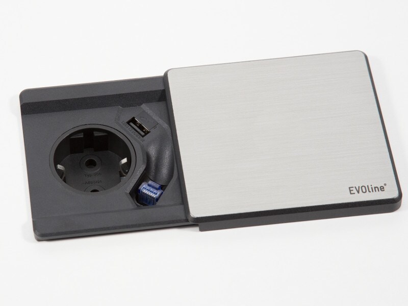 Der EVOline Square 80 ohne Qi-Ladefunktion mit 3,0m CAT6 Kabel mit Deckel in Edelstahl-Optik und Geh...
