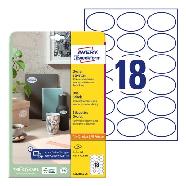 450 Ovale Etiketten - 63,5x42,3 mm »L6024REV-25«, Bedruckbar mit: SW-Laser, Farb-Laser, ...