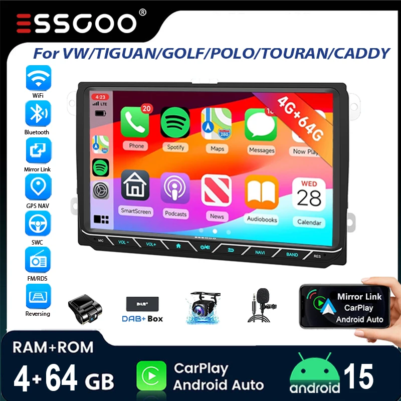 ESSGOO Autoradio Android 15 9" 4+64G für VW Tiguan Caddy EOS Jetta T5 Golf 5 6 Passat B6 B...