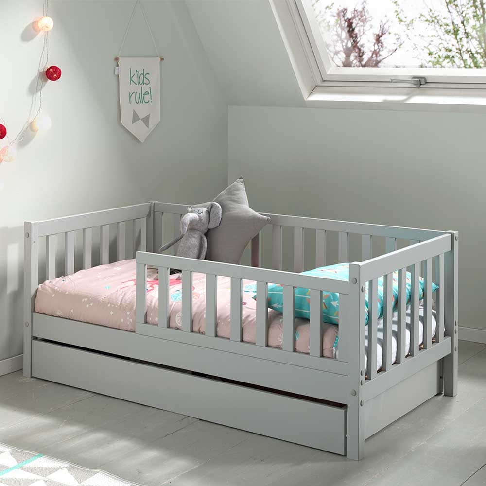 Graues Kinderbett mit Rausfallschutz 70x140 cm Liegefläche