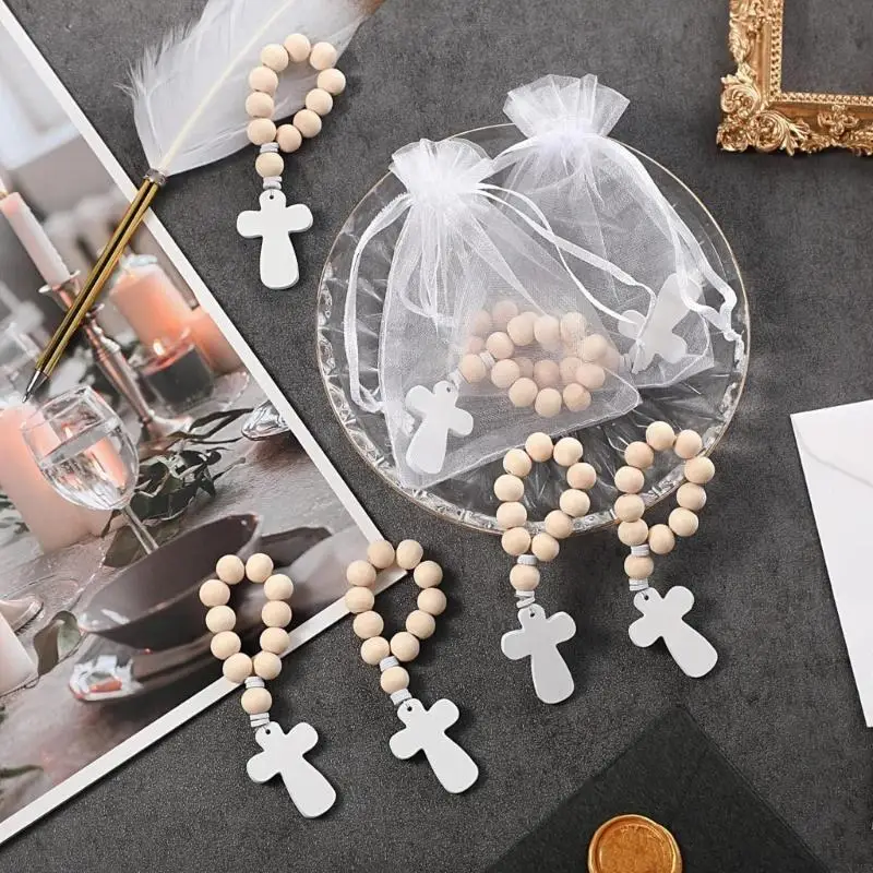6er-Set Gebets-Rosenkranz-Perlen mit Netztasche, Erstkommunion, Taufe, Geschenk, 6 Stück Holzpe...
