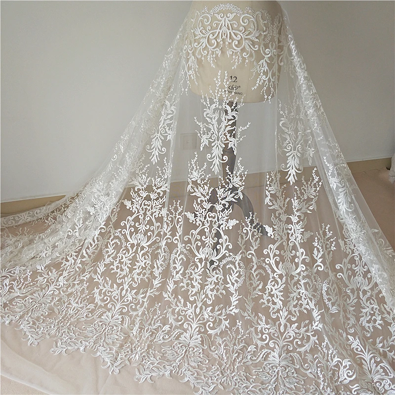 2024 Elfenbein neuestes Design Hochzeitskleid Kleid Spitzenstoff Braut mit Perlen 130 cm Breite Hoch...
