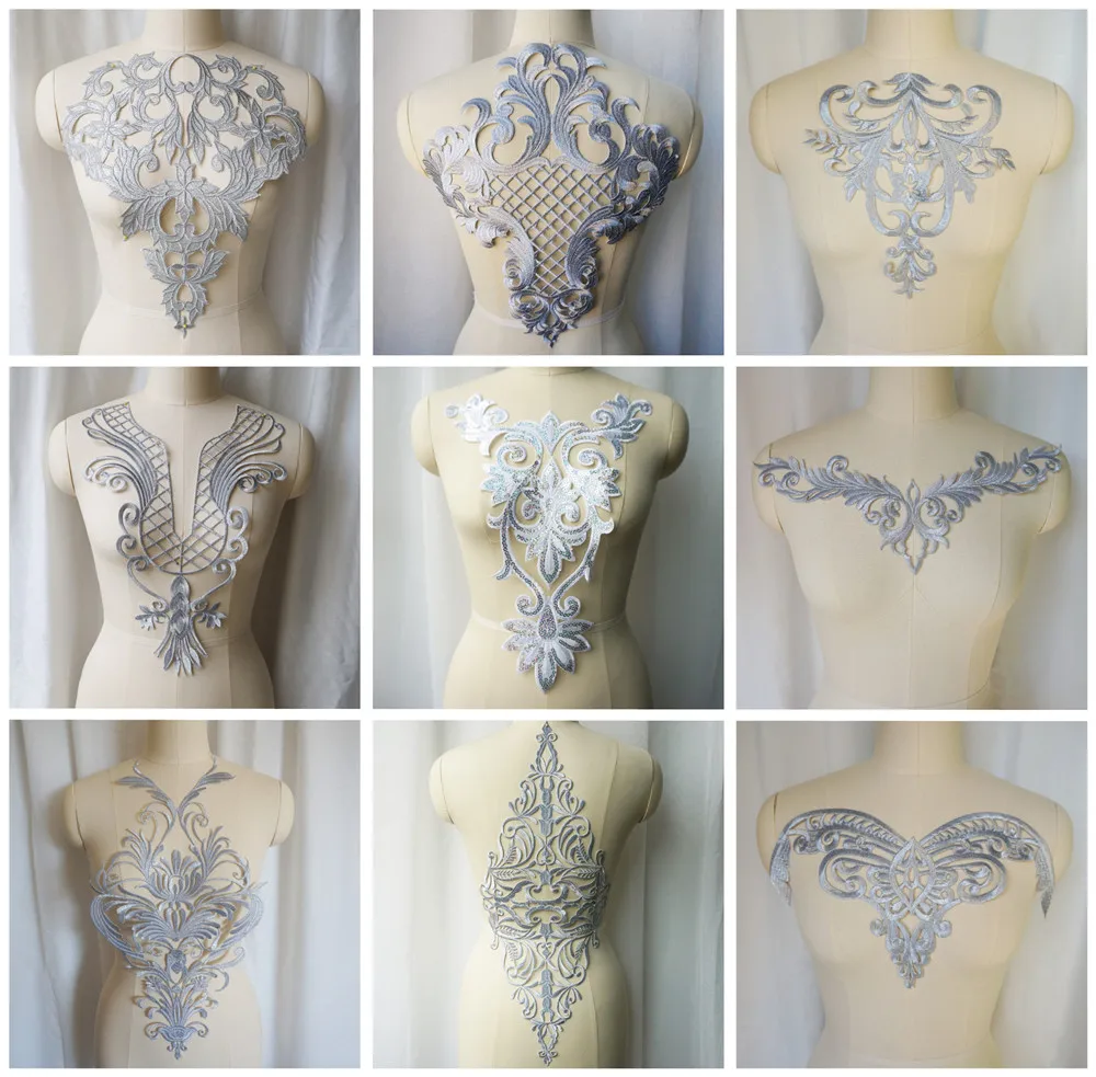 Silber Stickerei Barock Gitter Pailletten Blume Applikation Nähen Eisen Patch Kragen Hochzeitsk...