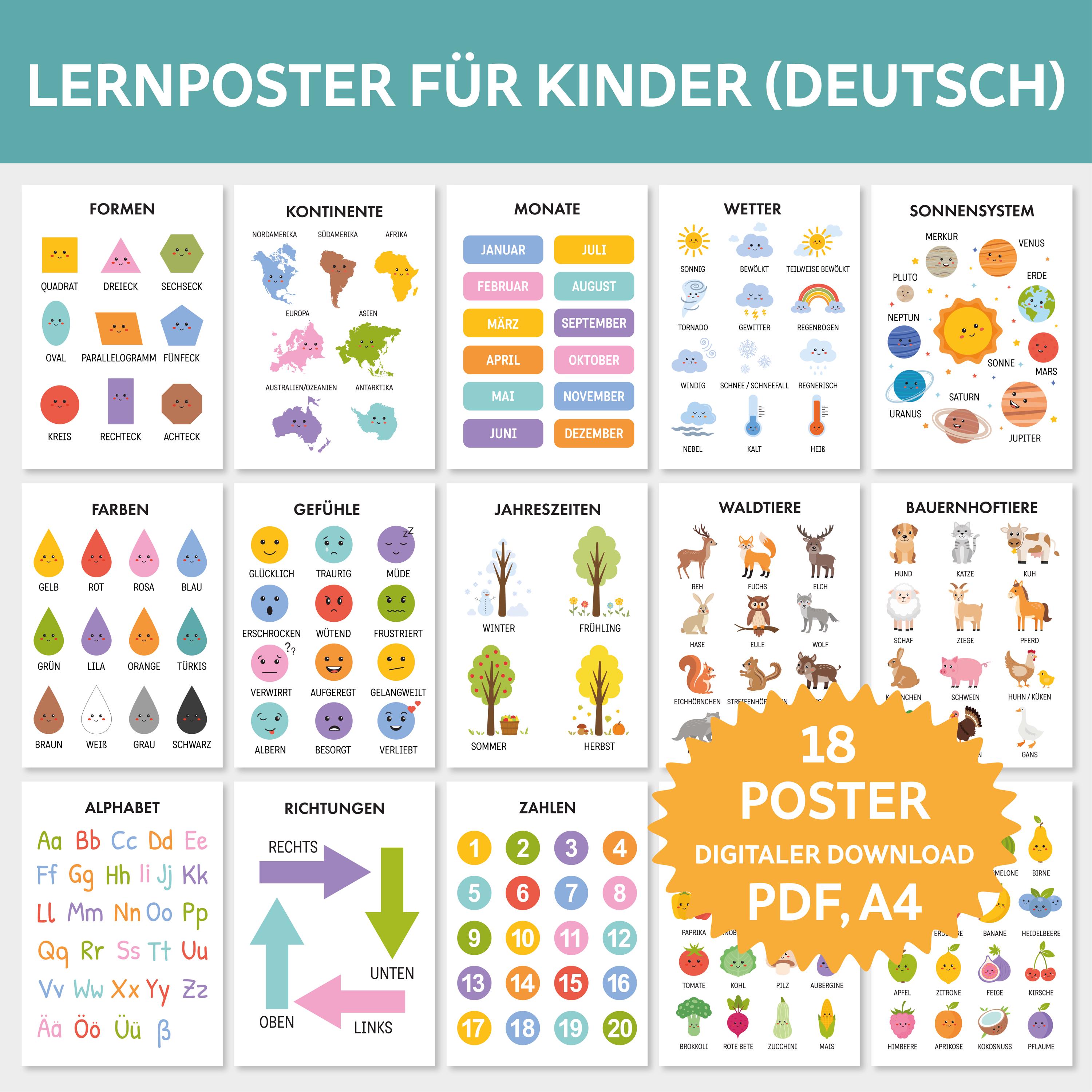 Diese liebevoll gestaltete Sammlung umfasst 18 Lernposter für Kinder auf Deutsch - perfekt geei...