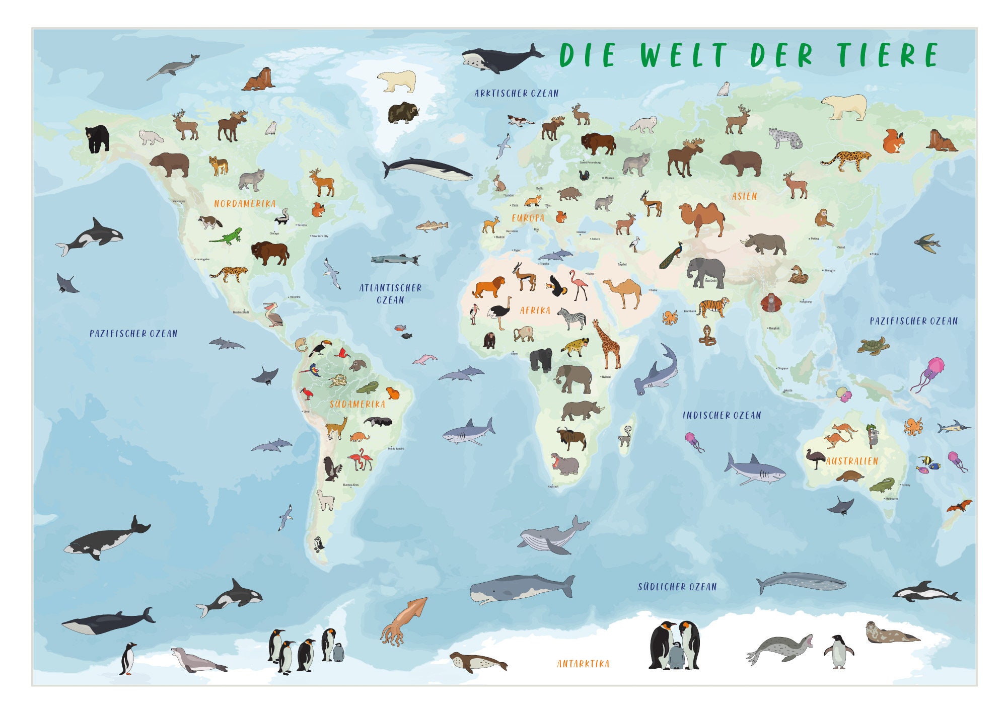 Großes Lernposter mit 44 von Hand illustrierten und beschrifteten Meerestieren, laden zum entd...