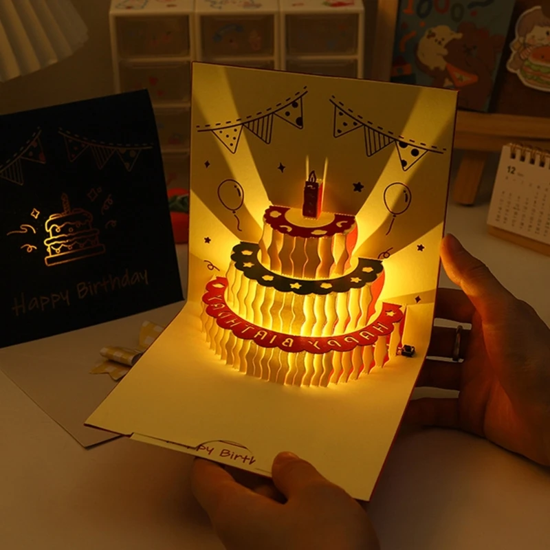 Q1JB 3D up Glücklich Geburtstag Karte Kuchen Licht Überraschung Mädchen Junge Festiva...