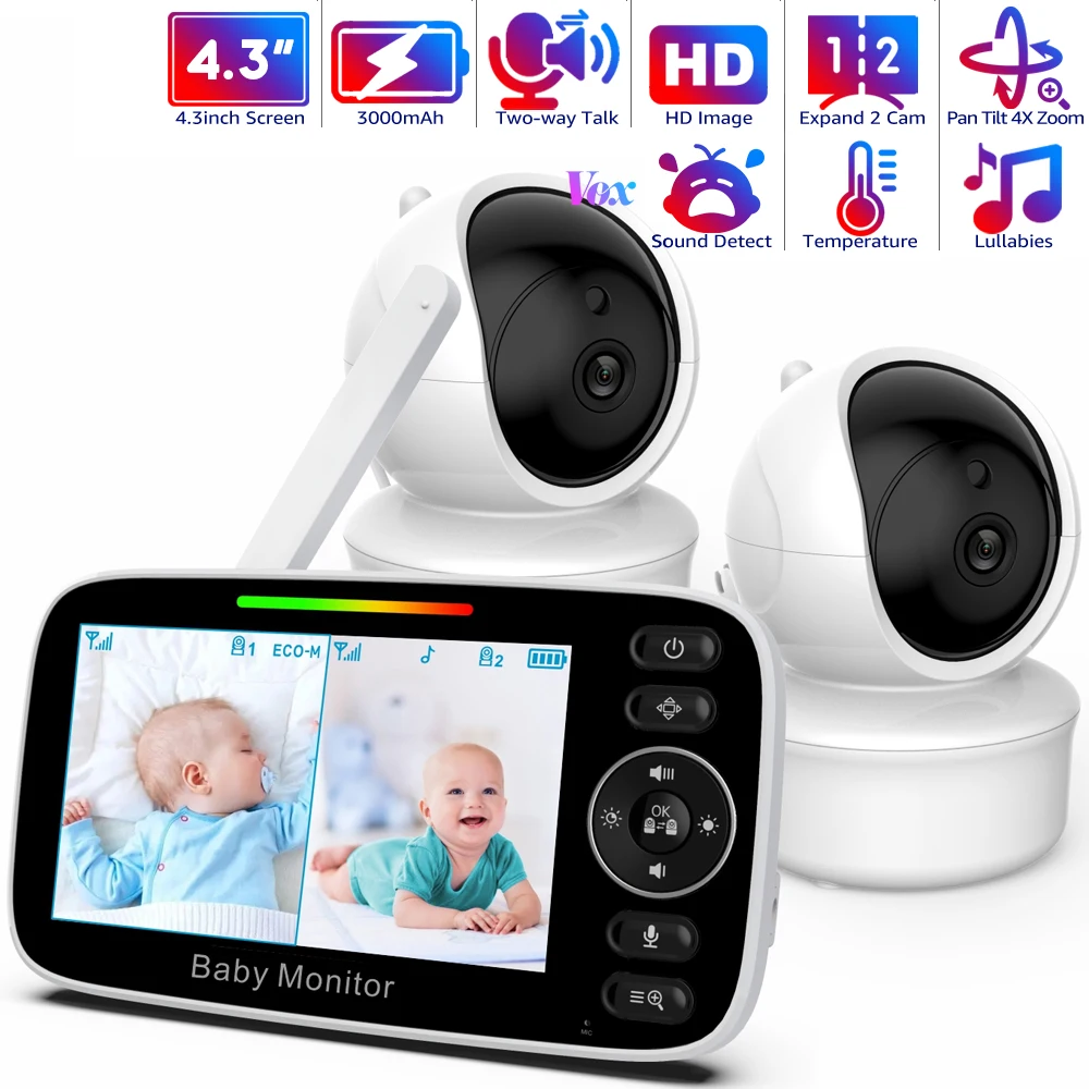 4,3-Zoll-Video-Babyphone mit 2 Kameras, Schwenk-Neige-Zoom, 3000-mA...
