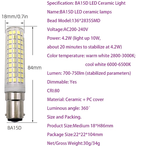 BA15D LED-Maisbirnen 6 W 220 V dimmbar, Doppelbajonettsockel fü...