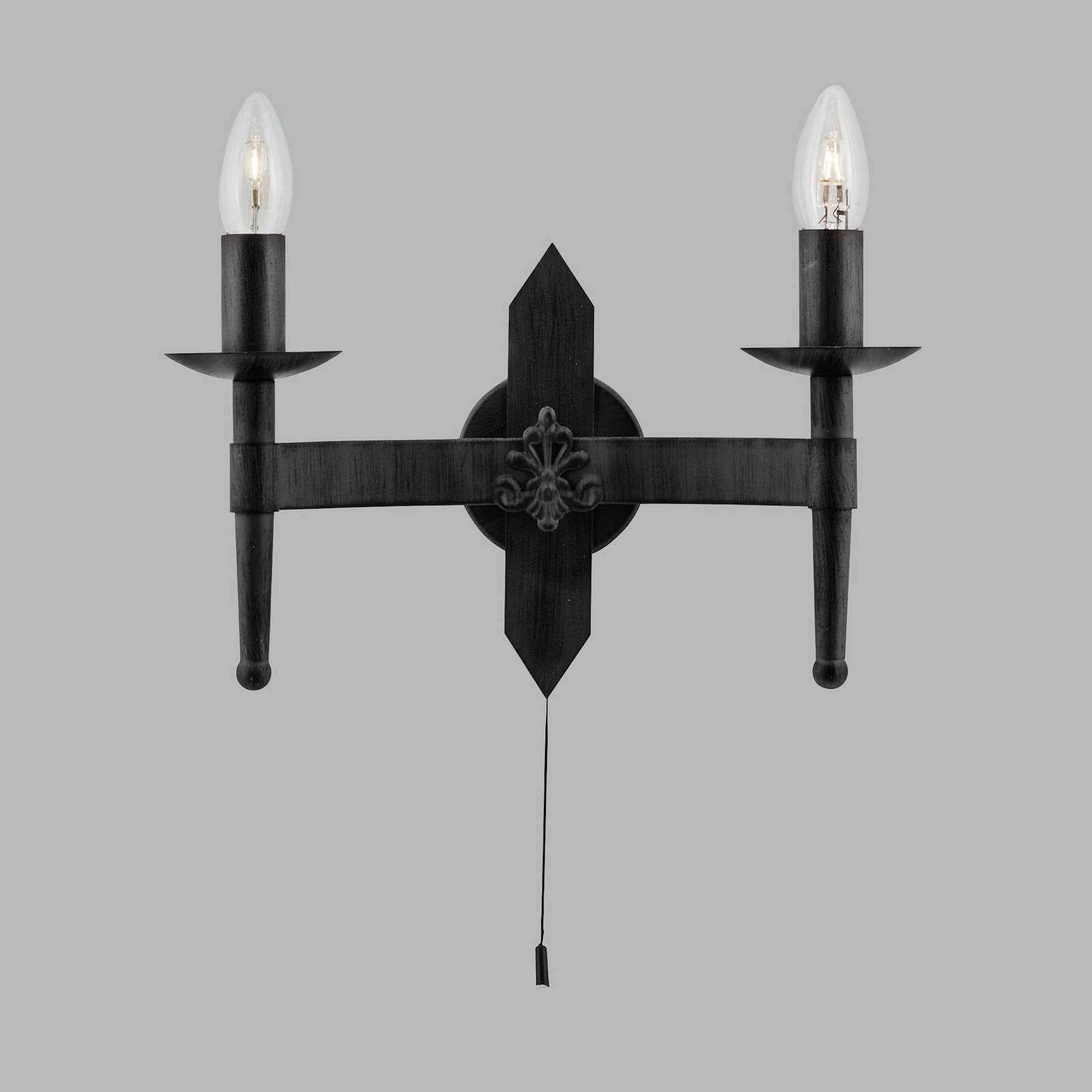 Die zweiflammige Wandleuchte Cartwheel II aus Schmiedeeisen begeistert mit antikem Design, das sich ...