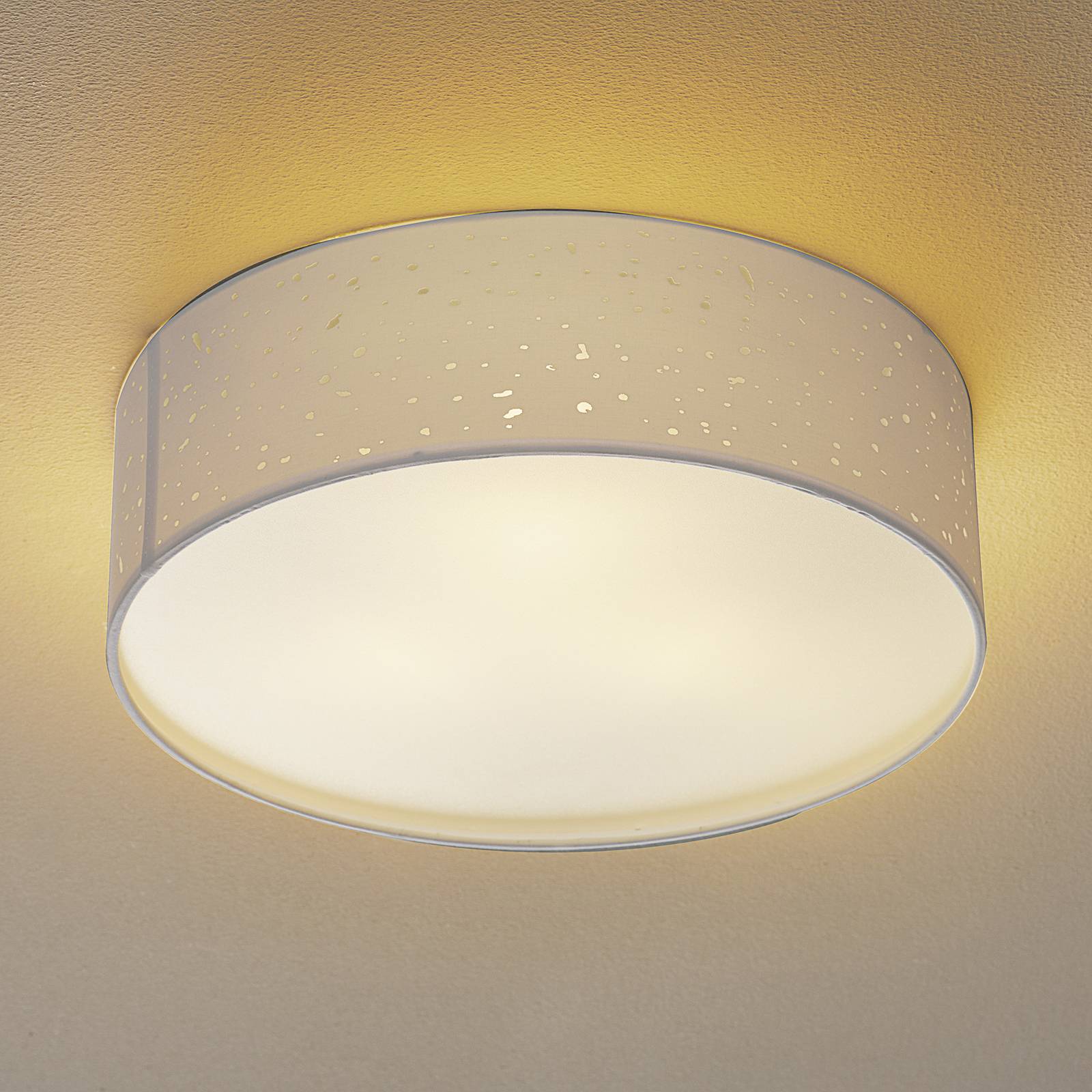 Die runde Deckenleuchte Thor ist mit einem weißen Dekor-Textilschirm mit Acryl-Abdeckung in We...