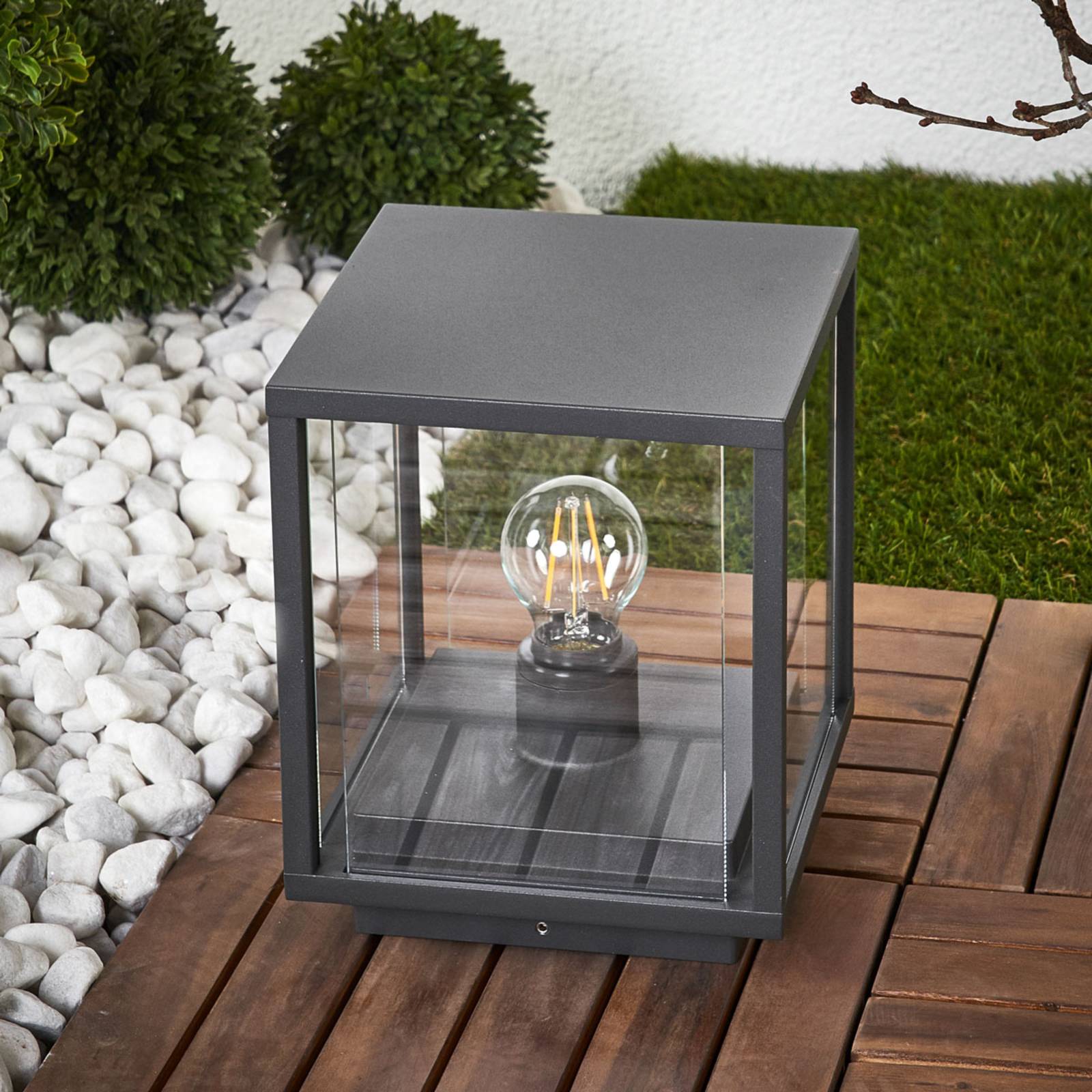 Die Sockelleuchte Annalea hat ein dunkelgraues Gestell und ist ansonsten mit gläsernen Abdeckun...