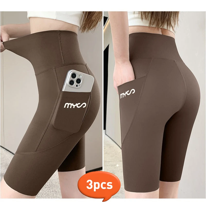 3 Stück/Damen Yoga-Shorts mit hoher Taille, 12,7 cm, Hai-Leggings mit Handytasche, Bauchkontrol...