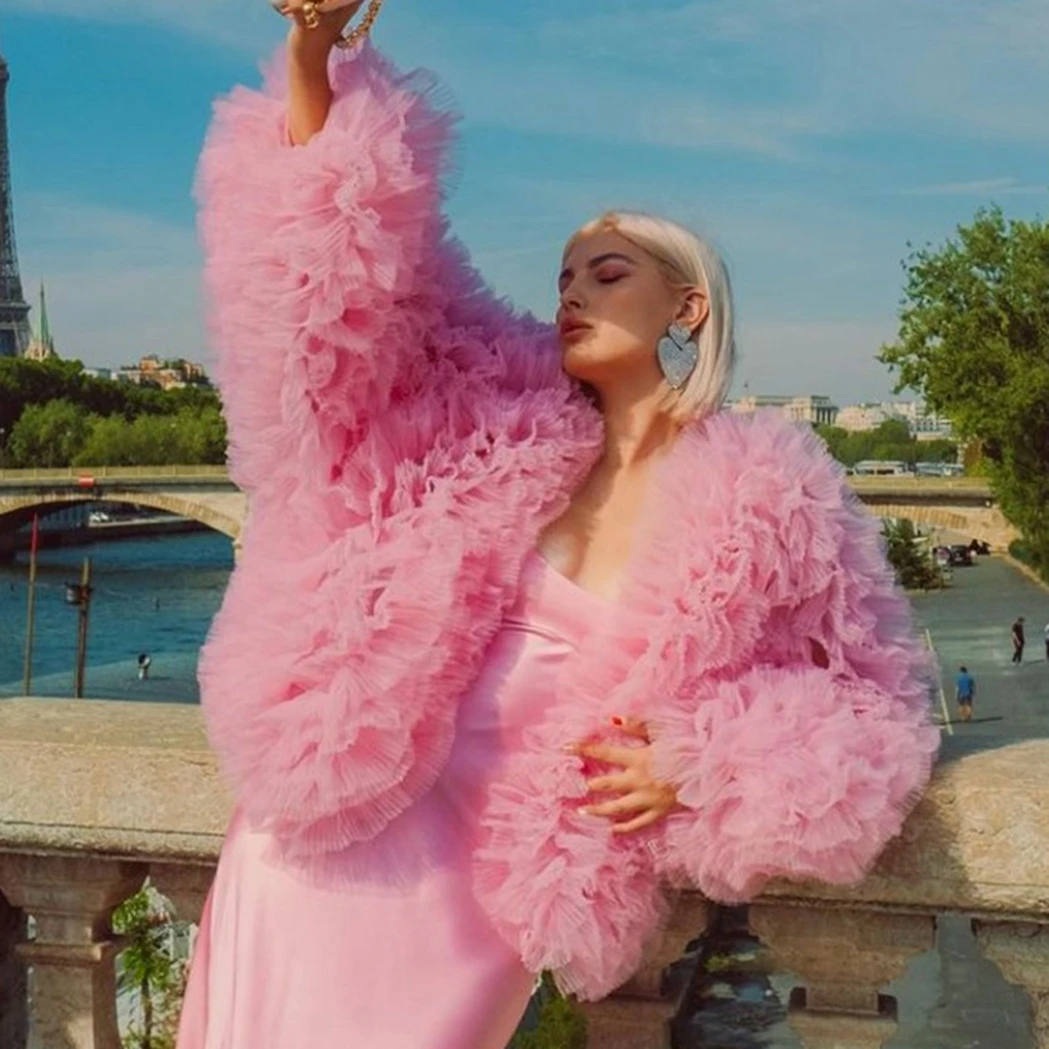 Trend ige Frauen flauschige Bluse Tüll Frauen jacke mit Rüschen ärmeln rosa Street Fa...