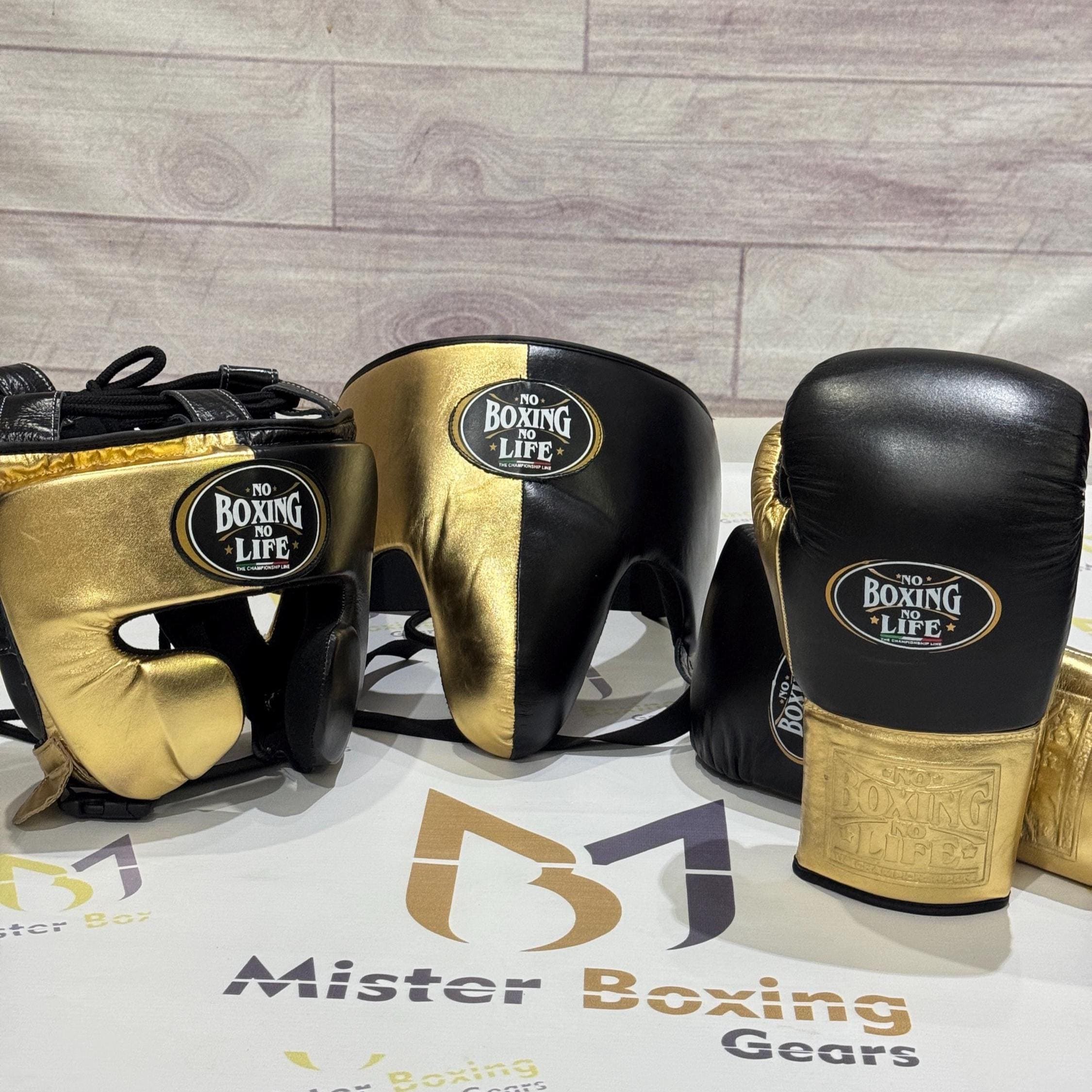 No Boxing Life Schwarz-Gold-Leder-Ausrüstung: Handschuhe, Kopf...