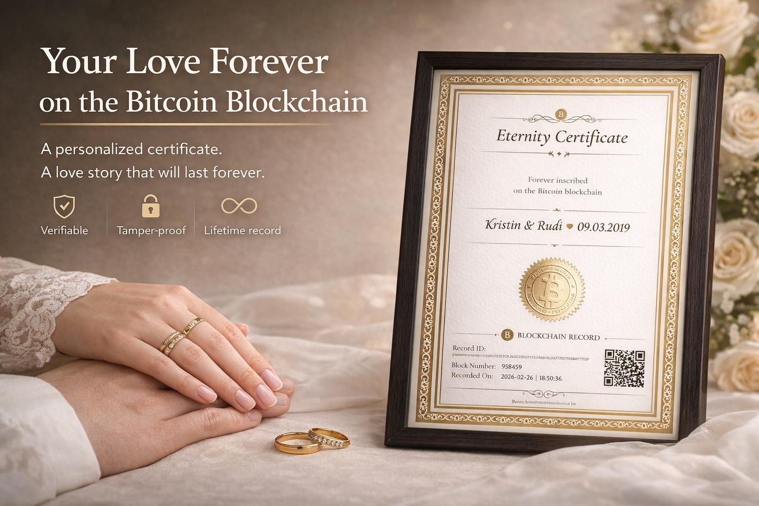 Your Love Forever on the Bitcoin Blockchain Record a special moment permanently on the Bitcoin block...