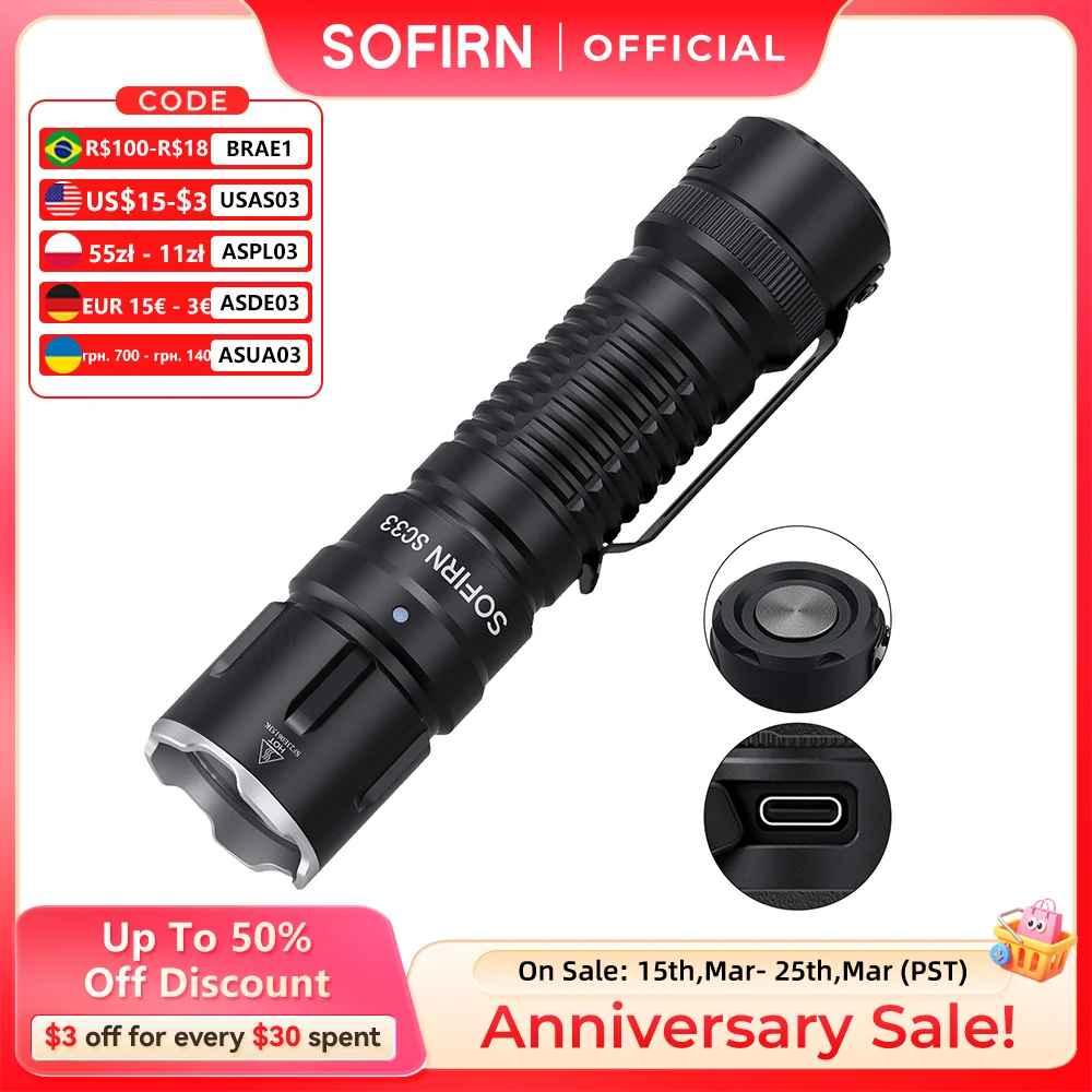 Sofirn SC33 5200 Lumen LED-Taschenlampe XHP70.3 HI Taktische Taschenleuchte Leistungsstarke wiederau...